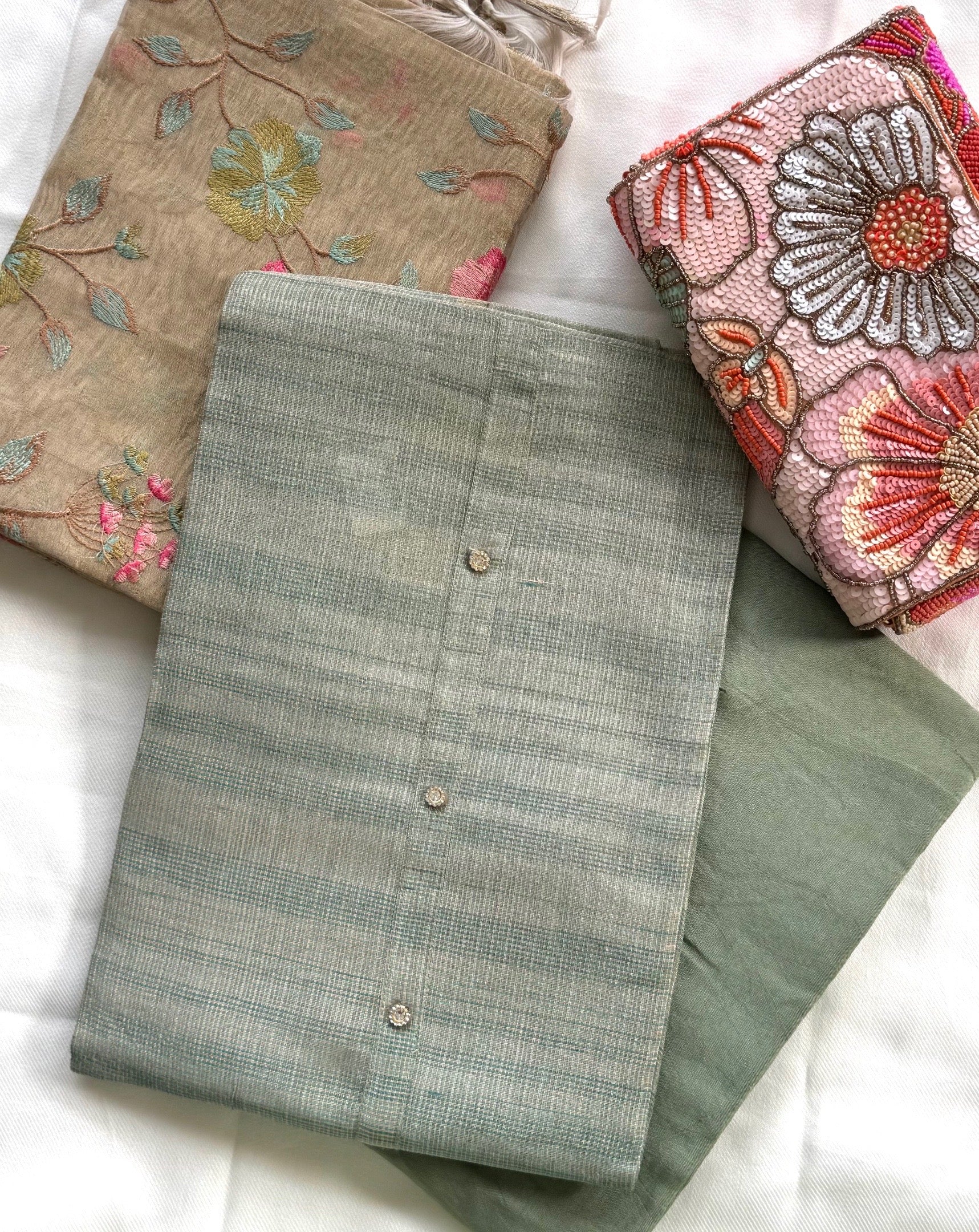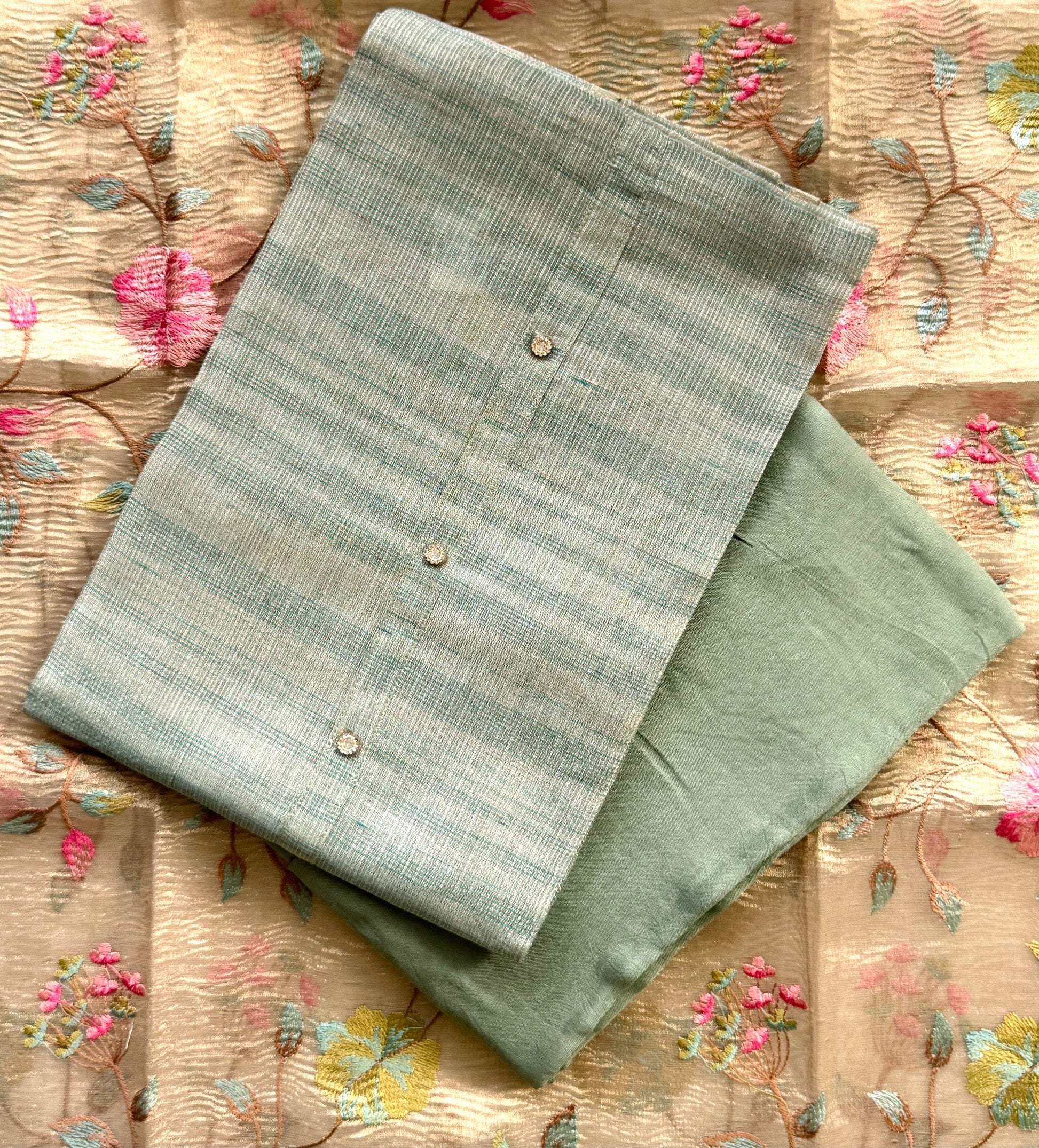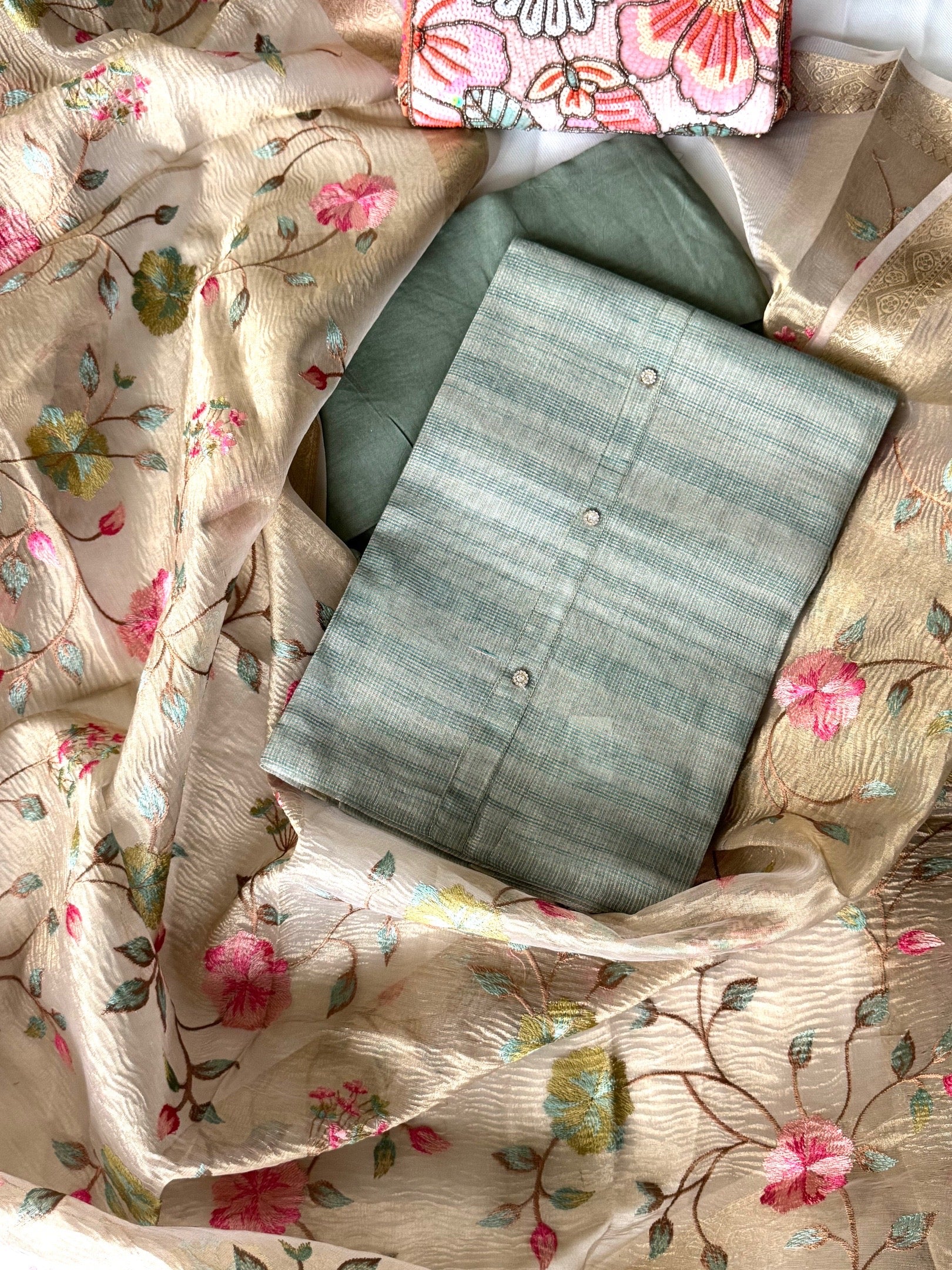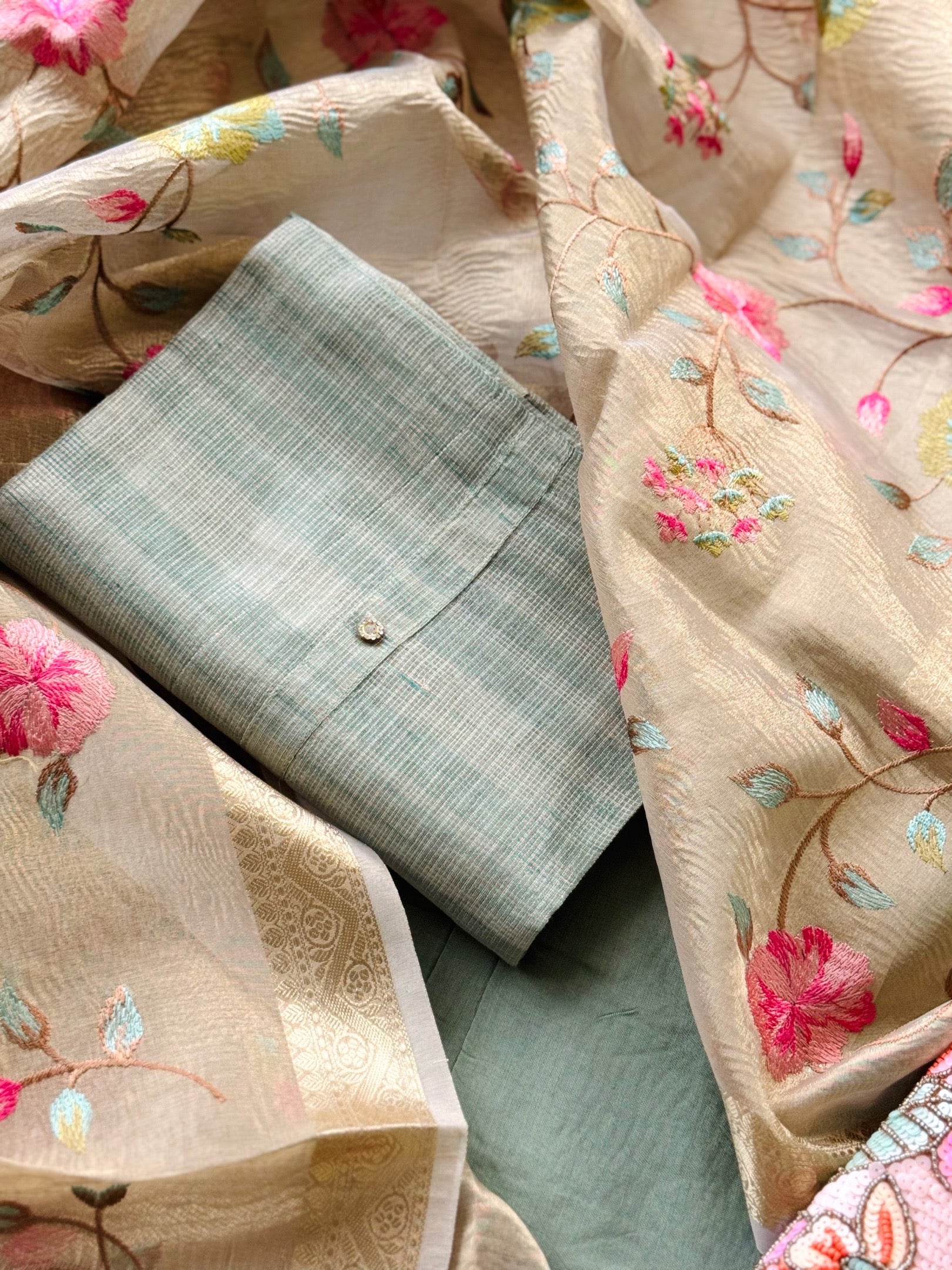 Against a tender beige canvas, blossoms of thread in peach, pink, and green unfurl in graceful patterns, while the tissue silk dupatta drapes like a whisper of silk breeze edged in gold. Every element—from the cooled touch of linen‑cotton to the delicate shimmer of stone—is crafted for timeless grace.