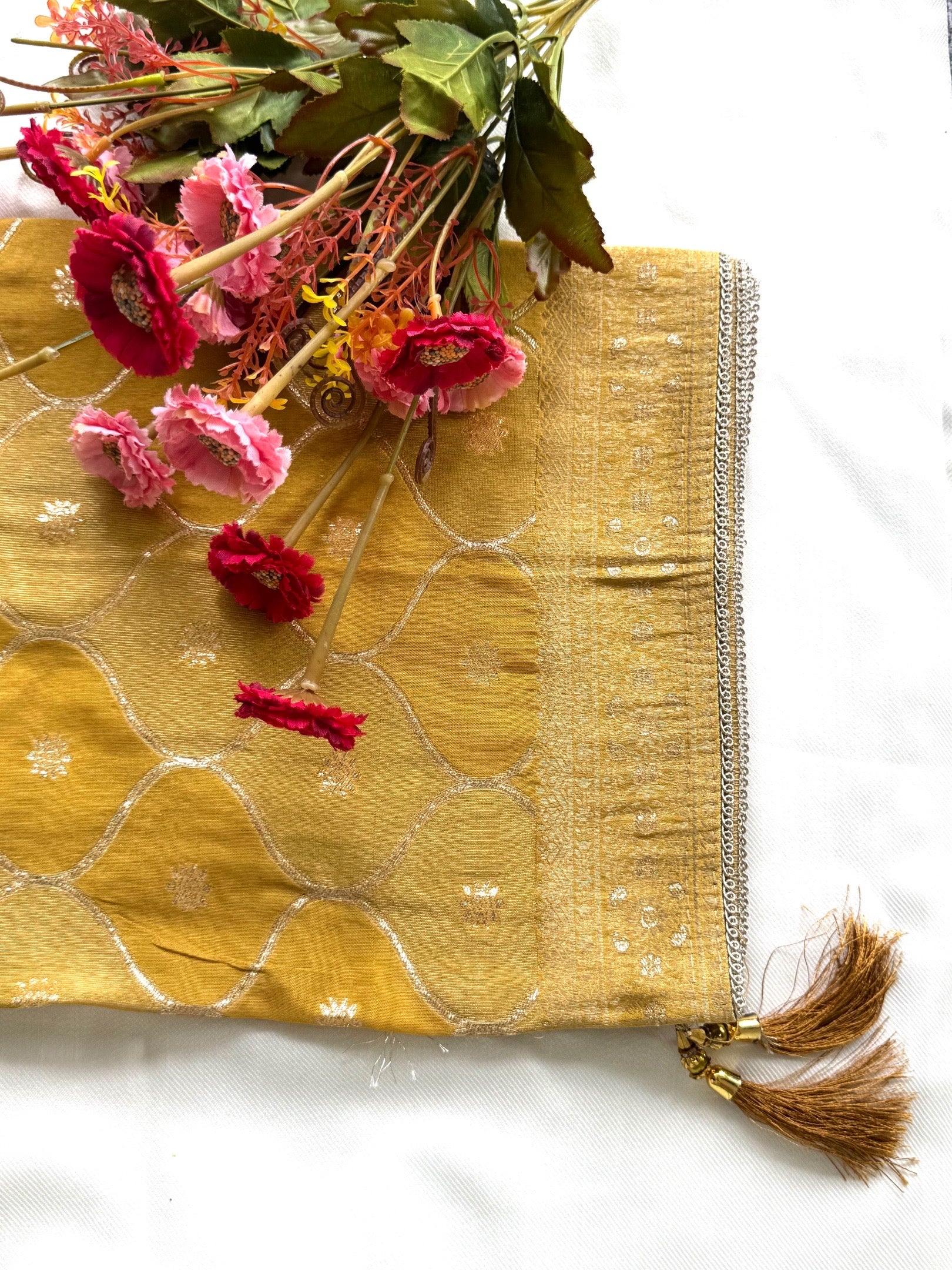 Step into festive elegance with this luxurious Yellow Banarasi Suit Set from Sakhi Luxe. Crafted from premium fabric, the suit is adorned with rich golden Banarasi booti all over, creating a timeless and opulent look. The neckline features intricate Zari Zardosi embroidery, enhanced with delicate pink and golden threadwork, adding a regal and celebratory touch. The hemline is finished with lace and pear embellishments, exuding refined sophistication and feminine charm.Paired with Golden Banarasi Dupatta it features all-over golden Banarasi booti, The edges are finished with delicate golden lace, adding a refined and sophisticated charm.