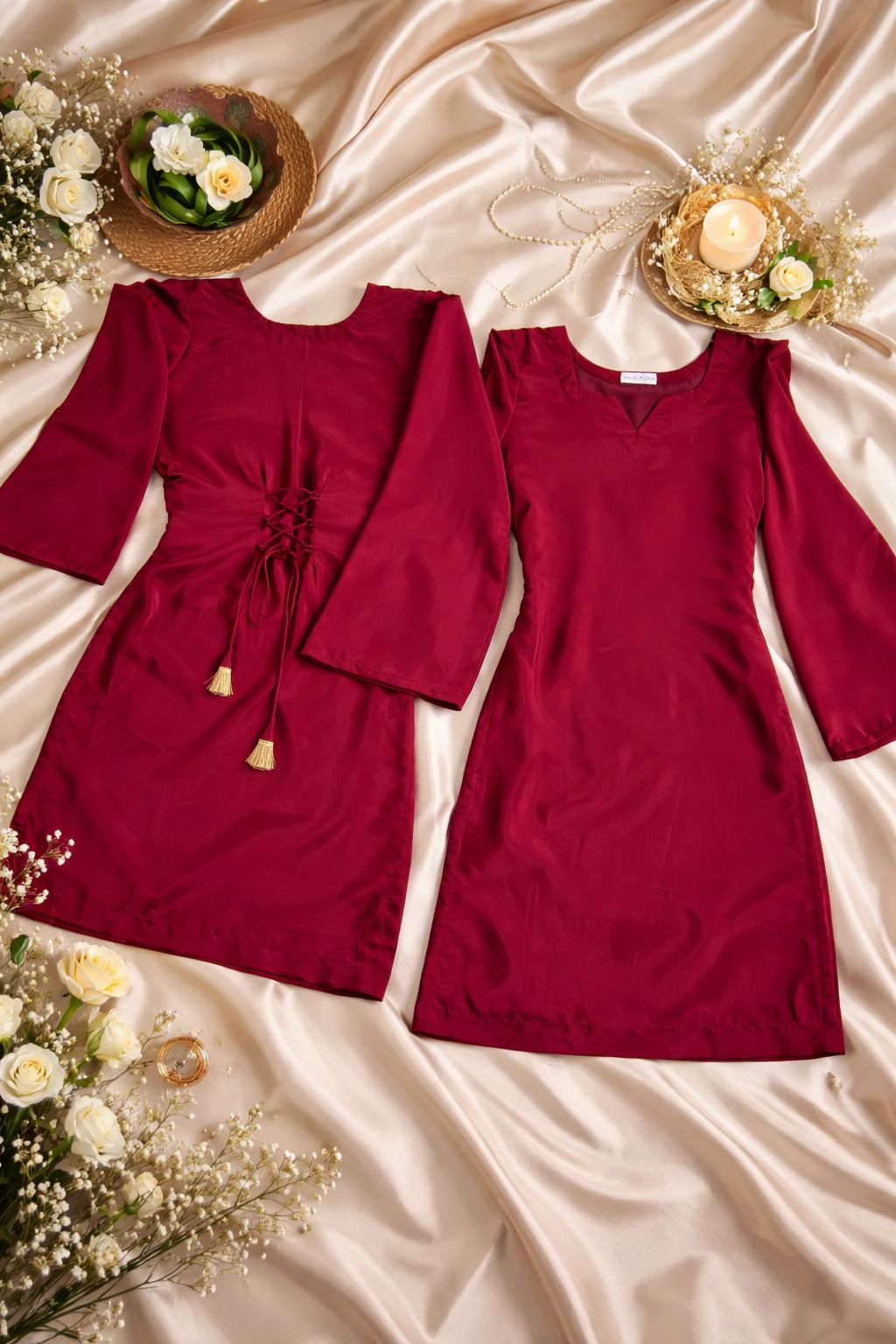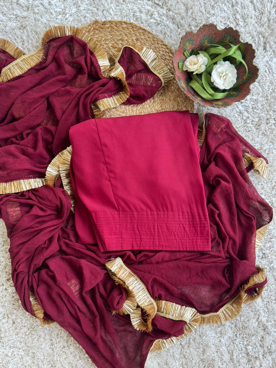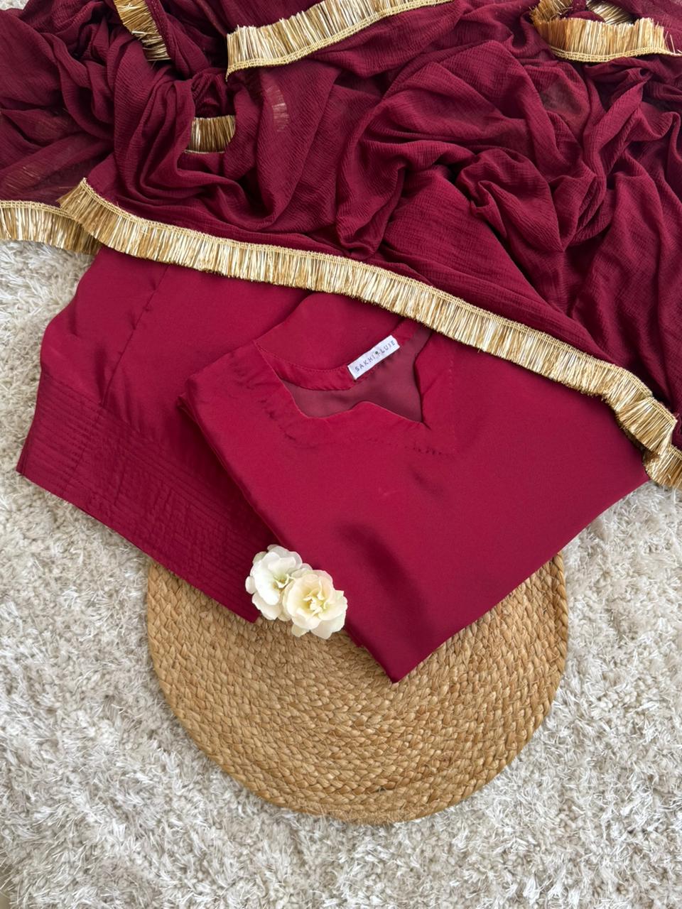 A refined maroon suit set by Sakhi Luxe, crafted in rich American crepe for the kurta and farshi salwar, featuring a back dori detail for a flattering fit. Finished with a pure chiffon dupatta adorned with elegant golden fringe lace, this ensemble embodies timeless sophistication.