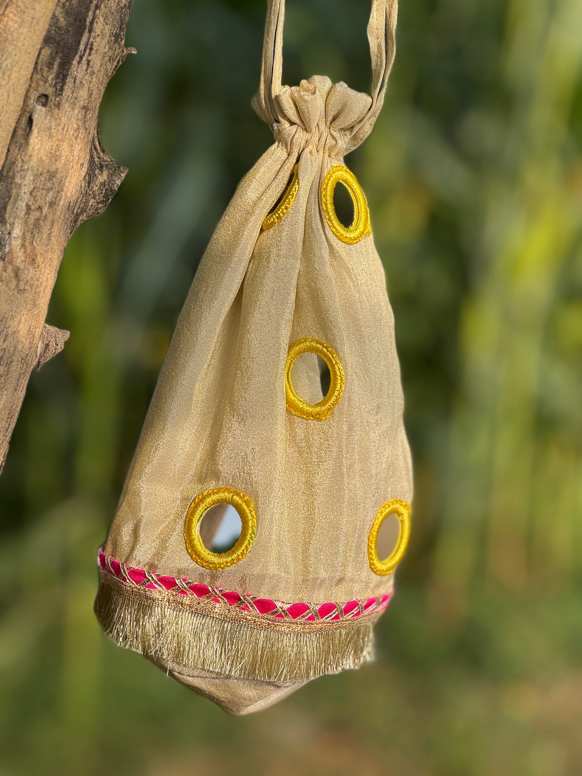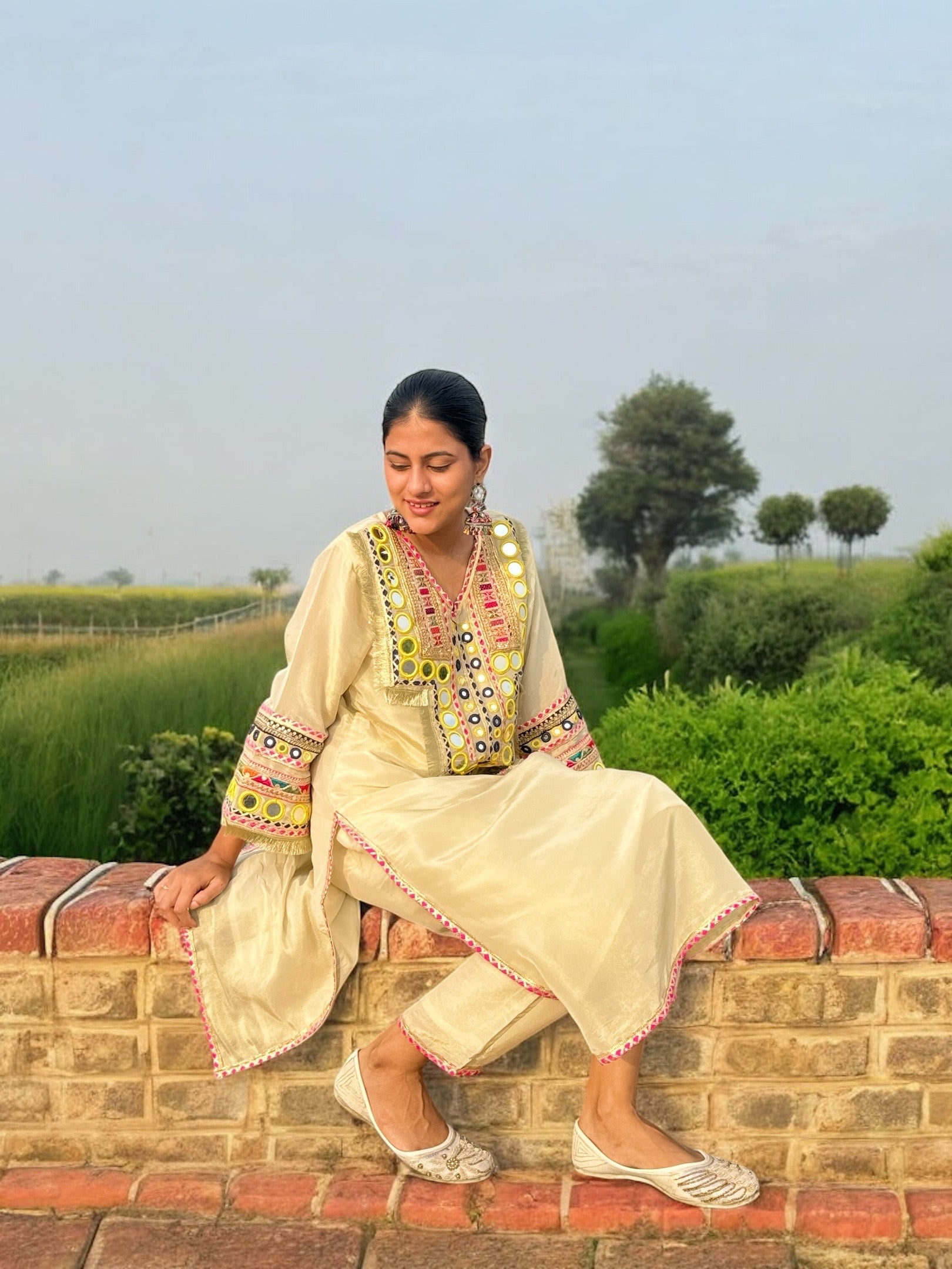 This Sakhi sand cream kurta features stunning heavy mirror (shisha) embroidery with golden fringes (tilla lace) on the neckline and sleeve edges for a dazzling ethnic look. Paired with matching pants, it offers a modern, comfortable silhouette. Perfect for festive occasions and traditional celebrations where elegance shines.