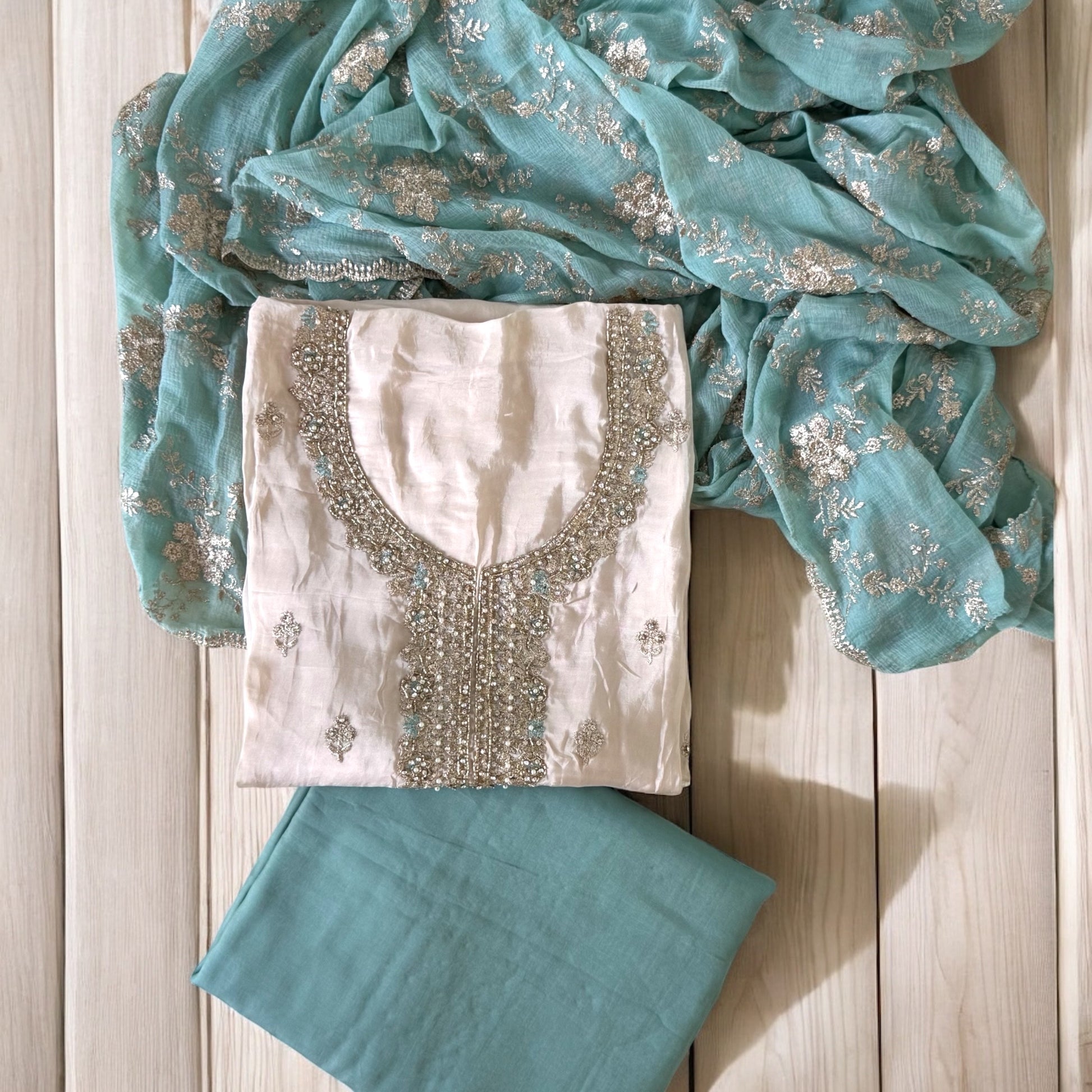 Luxuriate in the beauty of this exquisite ivory and aqua ocean color suit set. The kurta features intricate golden Resham thread and stone work all over delicate bootis, creating a rich, textured appearance. The heavy neckline is adorned with detailed Dabka, Resham thread, and pearl stone embroidery, enhanced subtly with minimal aqua shade touches for a refined contrast. A luxurious heavy border complements the ensemble, featuring golden Resham thread and stone embellishments with delicate hints of aqua color. Perfect for grand occasions, this suit set beautifully blends opulence with subtle color play. Luxurious aqua dupatta featuring detailed golden Resham thread embroidery throughout. Designed to add a royal touch to this outfit.