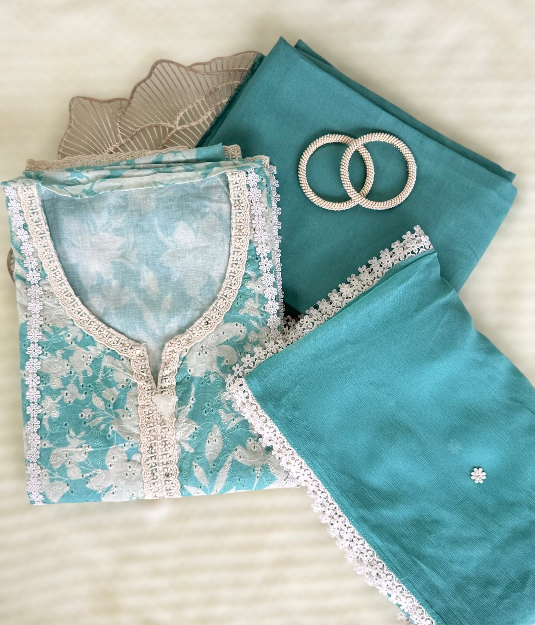 Soft cotton fabric forms the base of this turquoise kurta adorned with intricate cream floral schiffli work. Vertical lace panels highlight the kurta’s refined silhouette beautifully. The neckline is beautifully decorated with lace and Sitara work. Tassels add a subtle, elegant finish. In soothing turquoise chiffon, this dupatta carries all-over floral booti detailing. Lace-trimmed borders give it a touch of understated sophistication. Perfect for comfortable yet stylish festive wear.